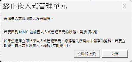 如果您選擇立即結束嵌入式管理單元,您將遺失所有尚未儲存的資料。若要立